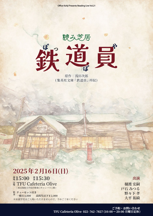 声優の樋渡宏嗣様が毎年行っている朗読会のフライヤーを制作いたしました。お芝居の台本となる原作を読んで、シンプルな中にも暖かみのあるデザインをしたいと考え、水彩でイラストを起こし、さらにデザインの際に古い写真のような加工を表裏共に加えました。